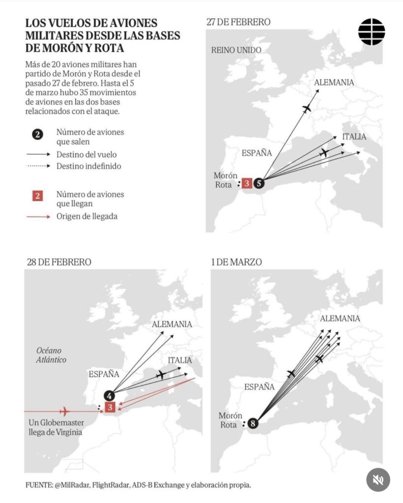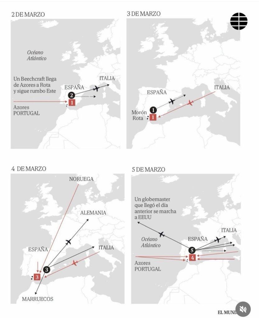 Entre el 27 de febrero -24 horas antes del ataque- y el 5 de marzo a las siete de la tarde, hubo no menos de 40 movimientos de vuelos en y desde Morón y Rota. A estos hay que restar cinco aterrizajes y despegues de un Beech que utilizó las dos bases en Andalucía y la de Torrejón para idas y vueltas a/desde Marruecos. Destacan especialmente 24 despegues de aviones de guerra para operar en los ataques en Irán con escala previa en Alemania e Italia.