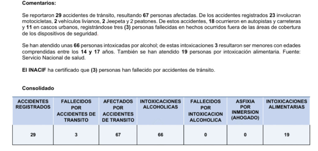 - Tres fallecidos y 67 afectados en 29 accidentes de tránsito durante el operativo.66 intoxicaciones alcohólicas, incluyendo tres menores de edad entre 14 y 17 años.19 casos de intoxicación alimentaria reportados por el Servicio Nacional de Salud.