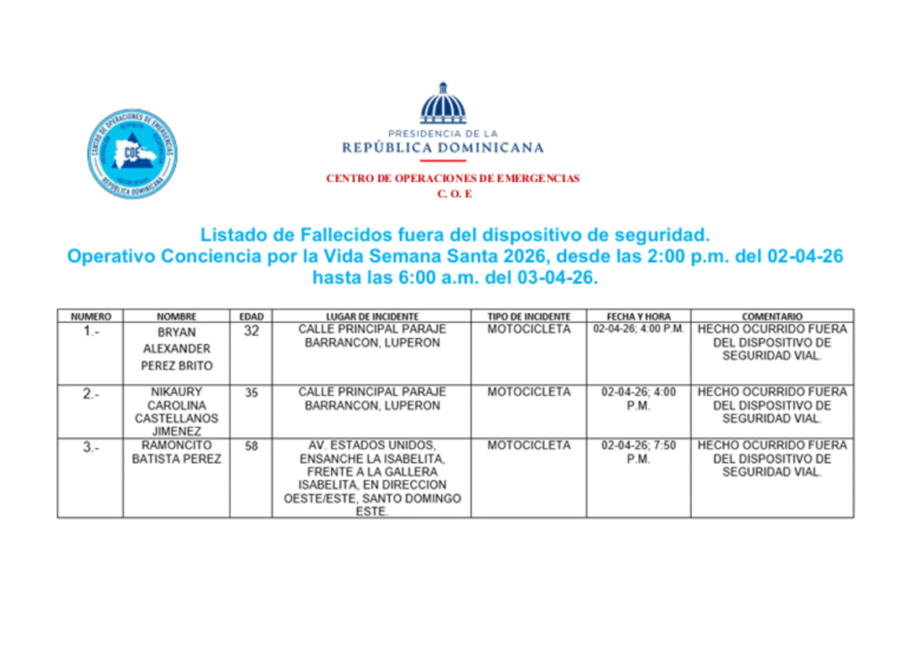 Santo Domingo. – El Centro de Operaciones de Emergencias (COE) reportó tres fallecidos, 29 accidentes de tránsito y 66 intoxicaciones alcohólicasen el primer boletín del operativo “Conciencia por la Vida: Semana Santa 2026”, correspondiente al período entre las 2:00 de la tarde del 2 de abril y las 6:00 de la mañana del 3 de abril.