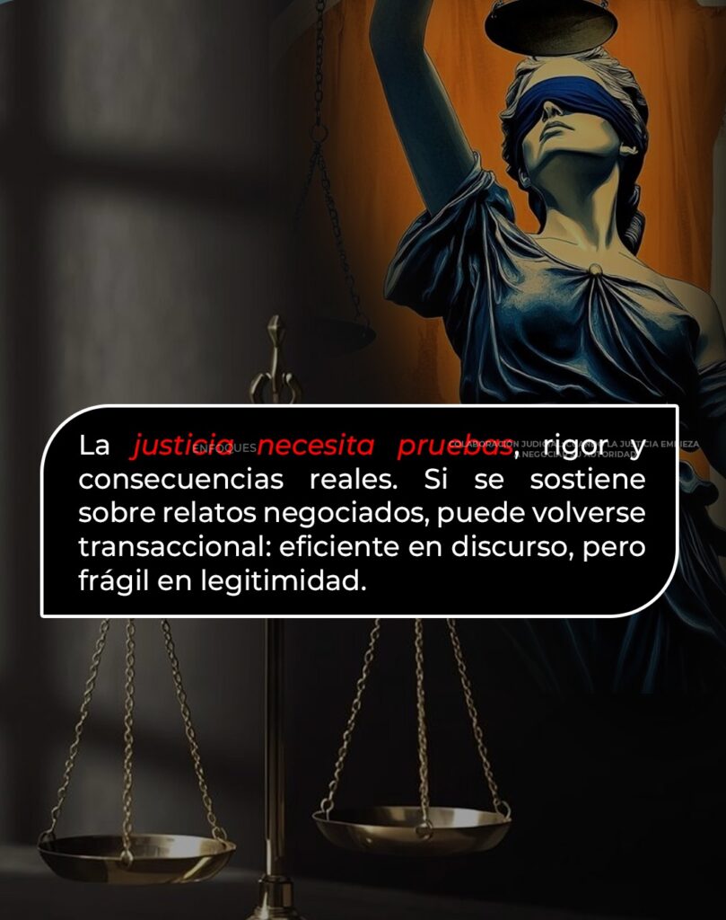 La justicia no puede sostenerse sobre relatos negociados. Necesita pruebas, rigor y consecuencias reales. De lo contrario, lo que se fortalece no es el Estado de derecho, sino una justicia transaccional: eficiente en el discurso, débil en legitimidad.