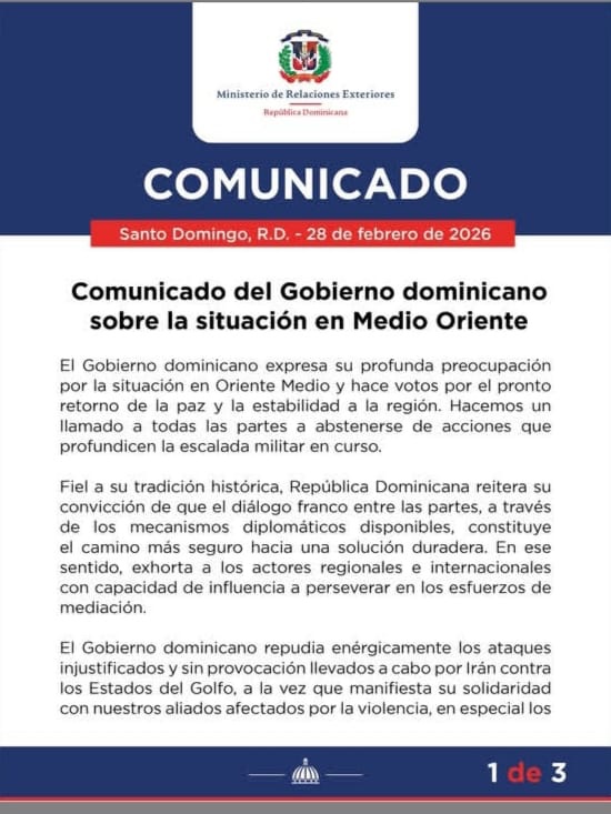 El Gobierno de la República Dominicana expresó este sábado su profunda preocupación ante la escalada del conflicto en el Medio Oriente, al advertir sobre las graves consecuencias humanitarias y el impacto en la estabilidad regional e internacional.
