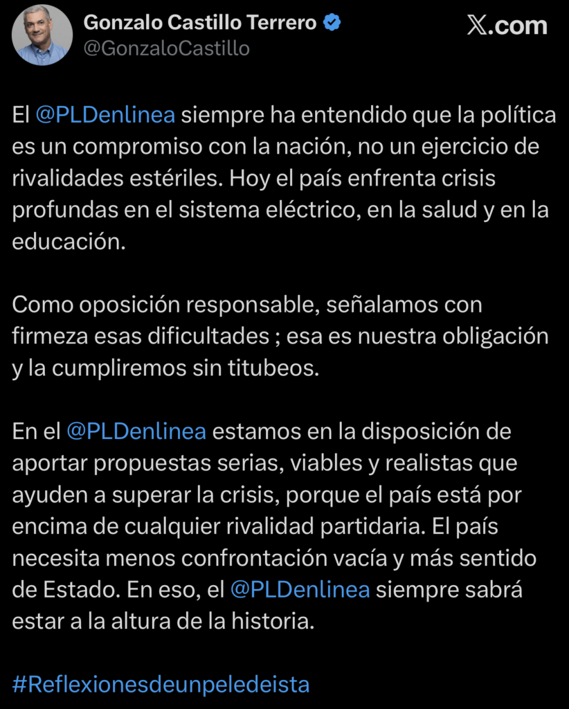 A través de su cuenta de X, el exministro de Obras Públicas y Comunicaciones sostuvo que, como oposición responsable, el PLD tiene la obligación de señalar con firmeza las dificultades actuales del país y aseguró que lo hará “sin titubeos”.