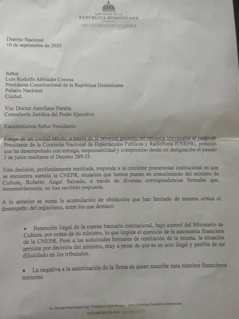 “Estos hechos constituyen, en conjunto, un abuso de poder inadmisible que ha bloqueado toda posibilidad de conducir una gestión eficiente y comprometida con la misión de la CNEPR. Bajo estas condiciones resulta imposible continuar al frente de la presidencia”, afirma Aybar en su carta.