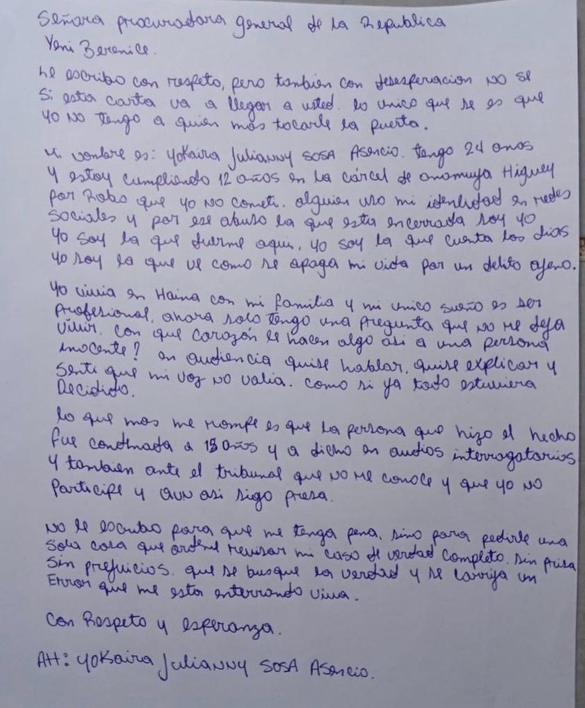 “No pido lástima; pido que se busque la verdad”, concluye, firmando “con respeto y esperanza”. Concluyó en la carta manuscrita la joven Yokairy Sosa.