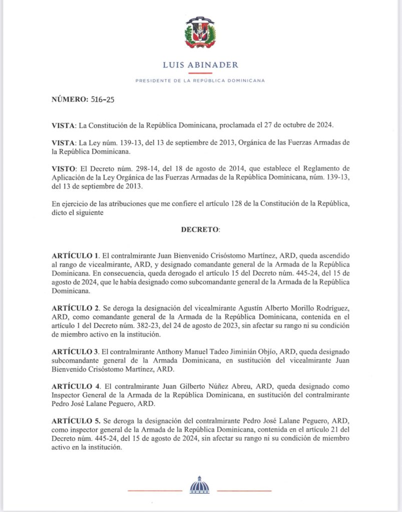 Santo Domingo.– El presidente Luis Abinader emitió ayer el Decreto núm. 516-25, mediante el cual se efectuaron importantes cambios en la Armada de la República Dominicana.