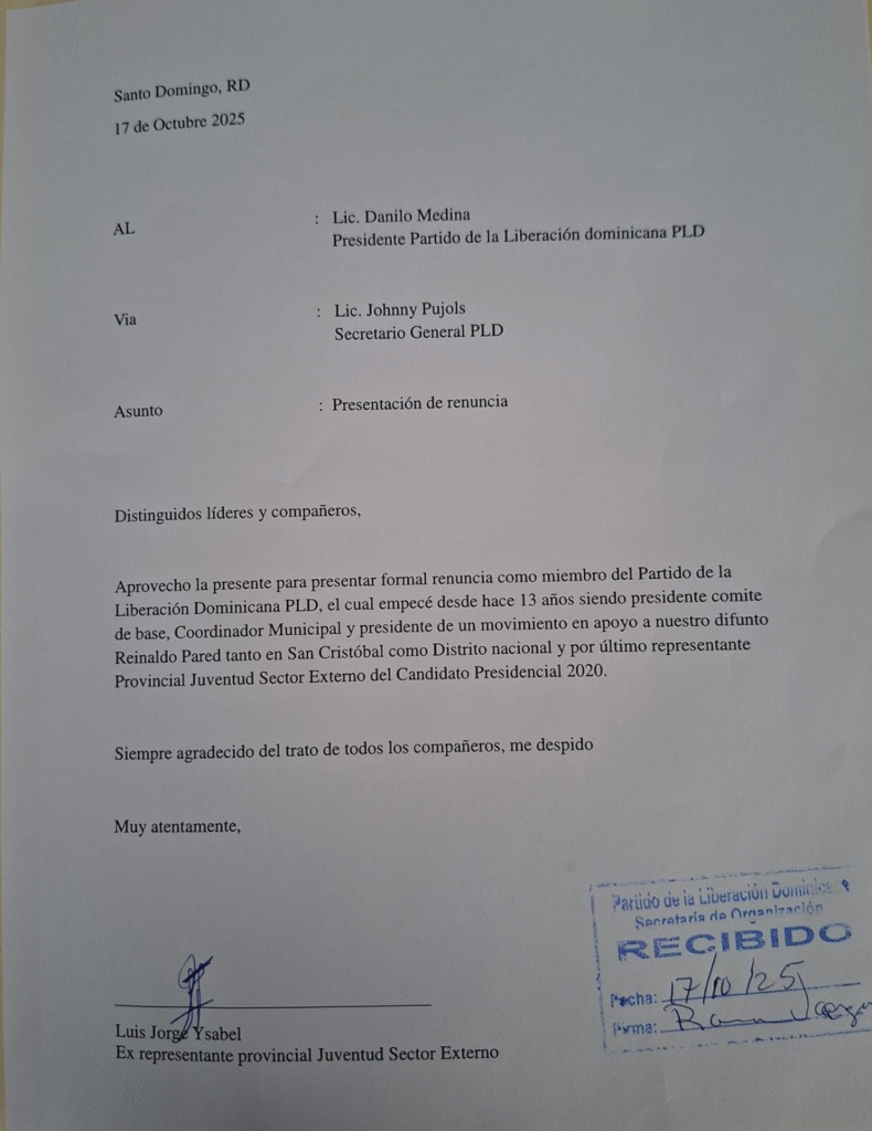 La carta de renuncia fue entrega en la sede principal de la organización morada y fue dirigida al secretario general ,Jhonny Pujols .